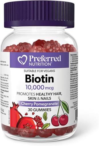 Preferred Nutrition Biotin is a hair, skin, and nail supplement delivered in delicious, cherry-pomegranate-flavoured, vegan gummies. Biotin is an essential B vitamin that helps strengthen hair, prevent splitting and brittle fingernails, and maintain health