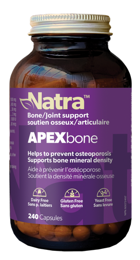 APEXbone by Natra is a scientifically designed formula to help prevent osteoporosis and support bone mineral density. This potent blend of essential nutrients includes calcium, magnesium, turmeric, boron, Vitamin D3, and Vitamin K2, working synergistically