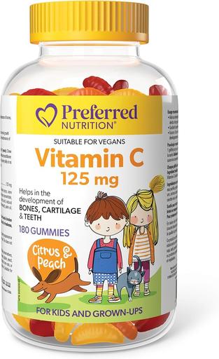 Preferred Nutrition Vitamin C 125 mg gummies help support a strong immune system and the development of bones, cartilage, and teeth in growing children. These vegan-friendly gummies are gelatin-free and non-GMO, and come in delicious citrus and peach flavo
