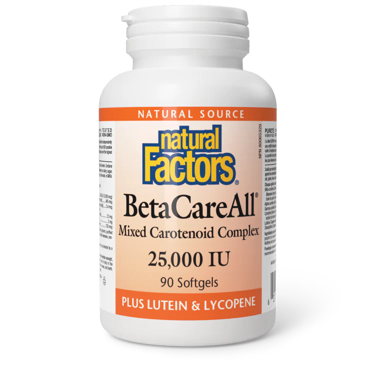 Natural Factors BetaCareAll is a unique mixed-carotenoid formula sourced from whole algae, mushrooms, and sustainable palm oil, providing natural beta-carotene. It also provides other carotenoids such as lycopene, lutein, and zeaxanthin. Converted into vitamin A in the body, beta-carotene is essential to many processes, including the maintenance of healthy vision, skin, mucous membranes, immunity, and bones and teeth. Provides antioxidant support Helps protect vision, including night vision Helps maintain skin health and immune function Helps in the development and maintenance of bones and teeth