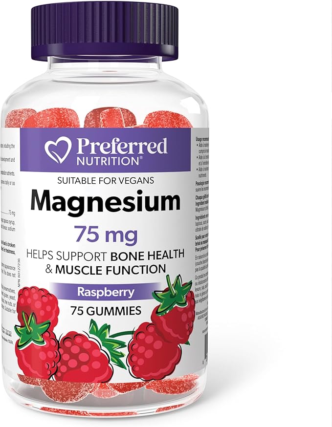 Preferred Nutrition Magnesium provides a highly absorbable form of magnesium delivered in delicious, raspberry-flavoured, vegan gummies. Magnesium is an essential mineral that helps maintain normal muscle function, bone development, and energy metabolism. Each gelatin-free gummy contains 75 mg of magnesium, making it a convenient and tasty way to supplement your magnesium intake. Supports proper muscle function, including the heart muscle Helps in the development and maintenance of bones and teeth Helps in energy metabolism and tissue formation Provides a source of magnesium to help prevent magnesium deficiency Suitable for vegetarians and vegans